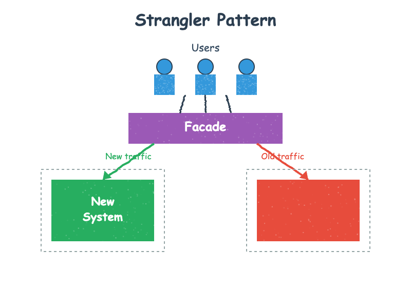 The Strangler Pattern works by creating a façade layer that sits between users and the legacy system. As new functionality is built or existing features are reimplemented, the façade routes requests to the appropriate destination—either the new system or the legacy one. Over time, more traffic flows to the new implementation until eventually the legacy system can be decommissioned entirely.