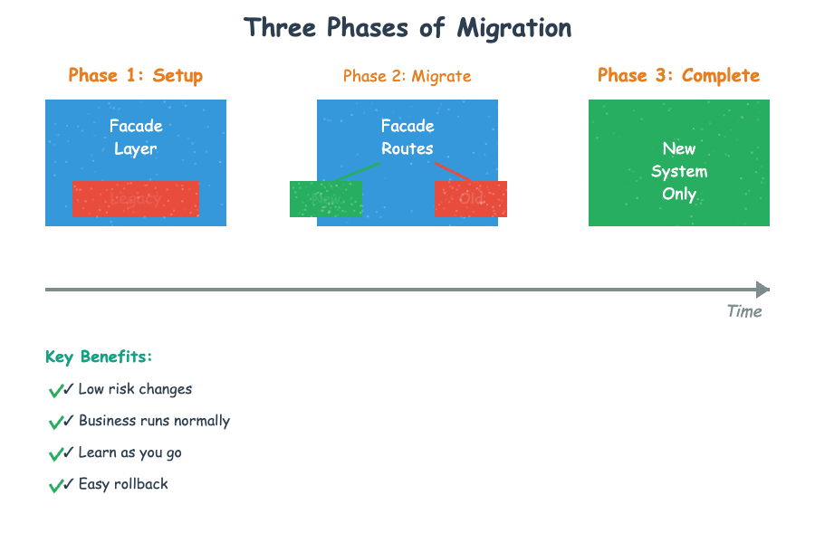 The pattern isn't just a migration strategy—it's a philosophy about how systems change over time. Legacy systems aren't failures to be eliminated; they're successful systems that need to evolve. By wrapping rather than replacing, routing rather than rewriting, and learning rather than assuming, teams can modernize even the most complex systems without the drama of big-bang rewrites.