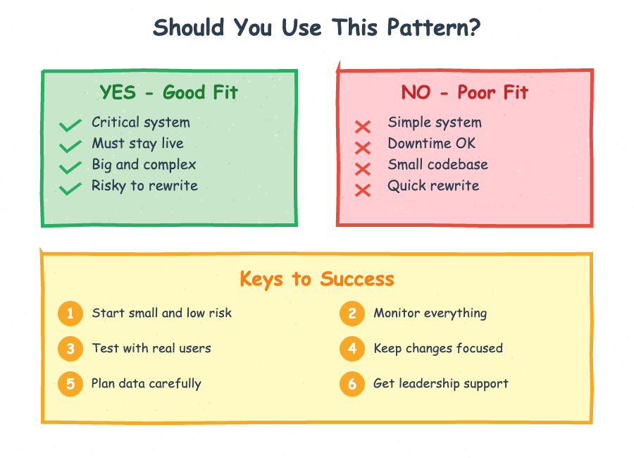 The Strangler Pattern isn't always the right choice. For systems with minimal complexity or those that can tolerate downtime, a complete rewrite might be faster and simpler. When the legacy system's architecture is fundamentally sound but just needs modernization of specific components, other patterns like service extraction or API versioning might be more appropriate.