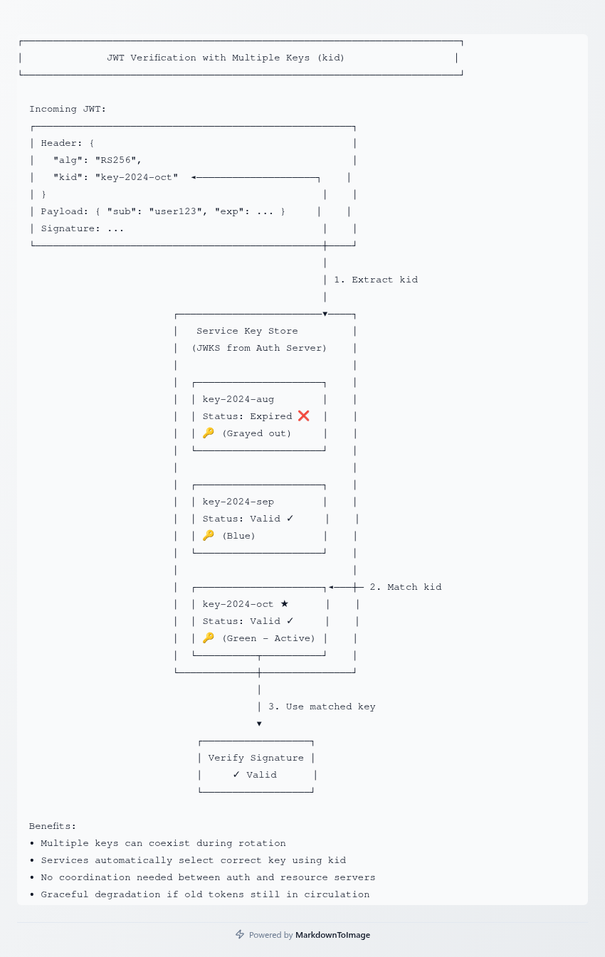Key identifiers (kid) in the JWT header play a crucial role in rotation. Each key pair receives a unique identifier, and services use this kid to select the appropriate public key from their keystore. When multiple keys are valid simultaneously, the kid disambiguates which key signed a particular token. This mechanism enables graceful rotation without requiring simultaneous updates across all services.