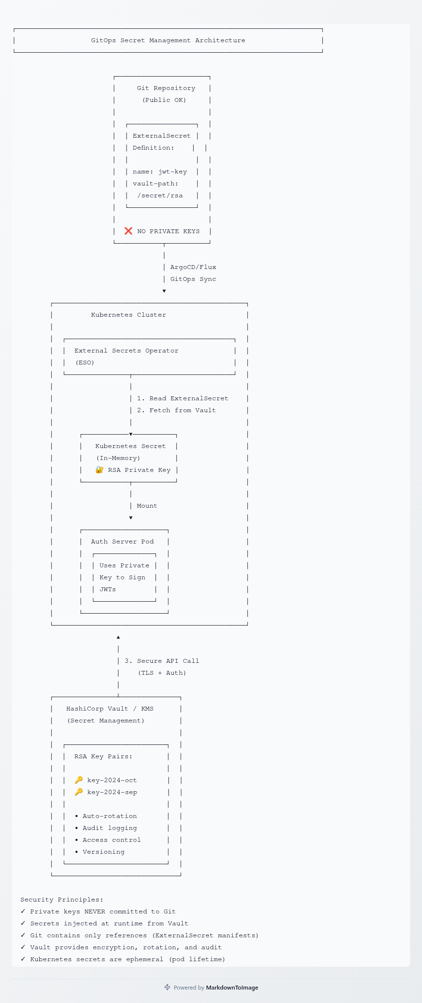 JSON Web Tokens (JWTs) have become the de facto standard for authentication and authorization in modern distributed systems. When combined with RSA encryption and proper key rotation strategies, they provide a robust security foundation for enterprise applications. However, managing cryptographic keys in GitOps environments presents unique challenges that require careful architectural consideration.