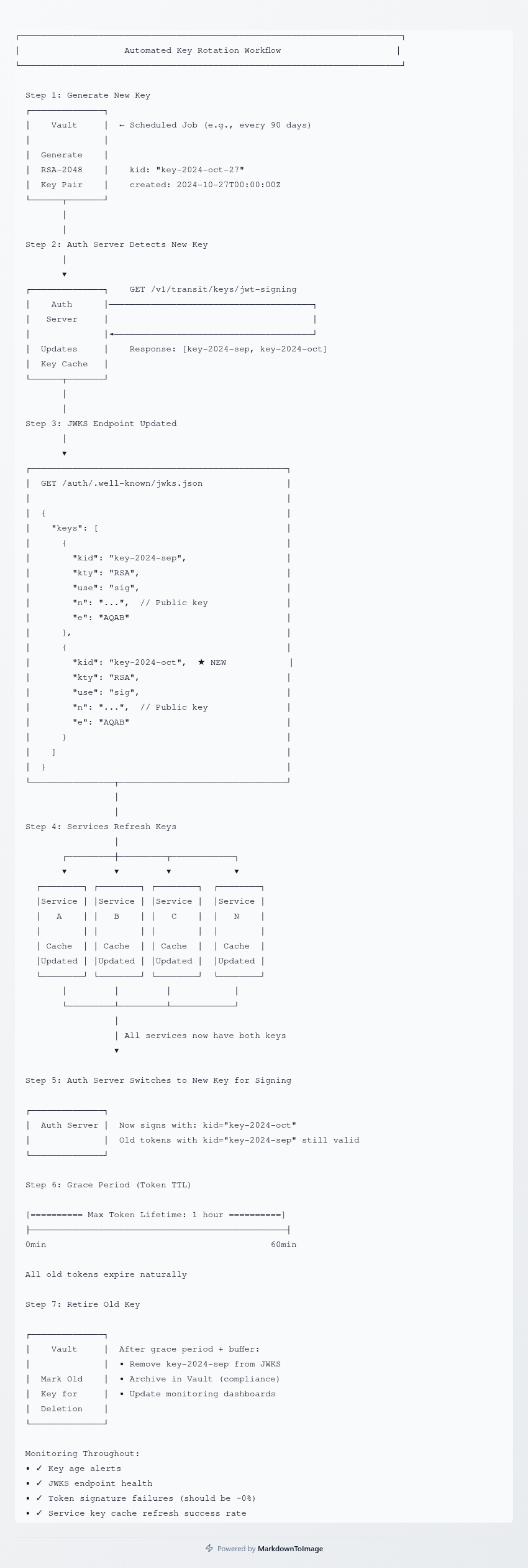 The rotation workflow typically follows this sequence: Vault generates a new RSA key pair with a unique kid, the authorization server detects the new key through Vault's API, the JWKS endpoint begins advertising both old and new public keys, the authorization server switches to signing with the new key, verification services refresh their key cache and can now verify tokens signed with either key, and after the maximum token lifetime elapses (commonly 1 hour for access tokens), the old key is removed from JWKS and marked for deletion in Vault.
