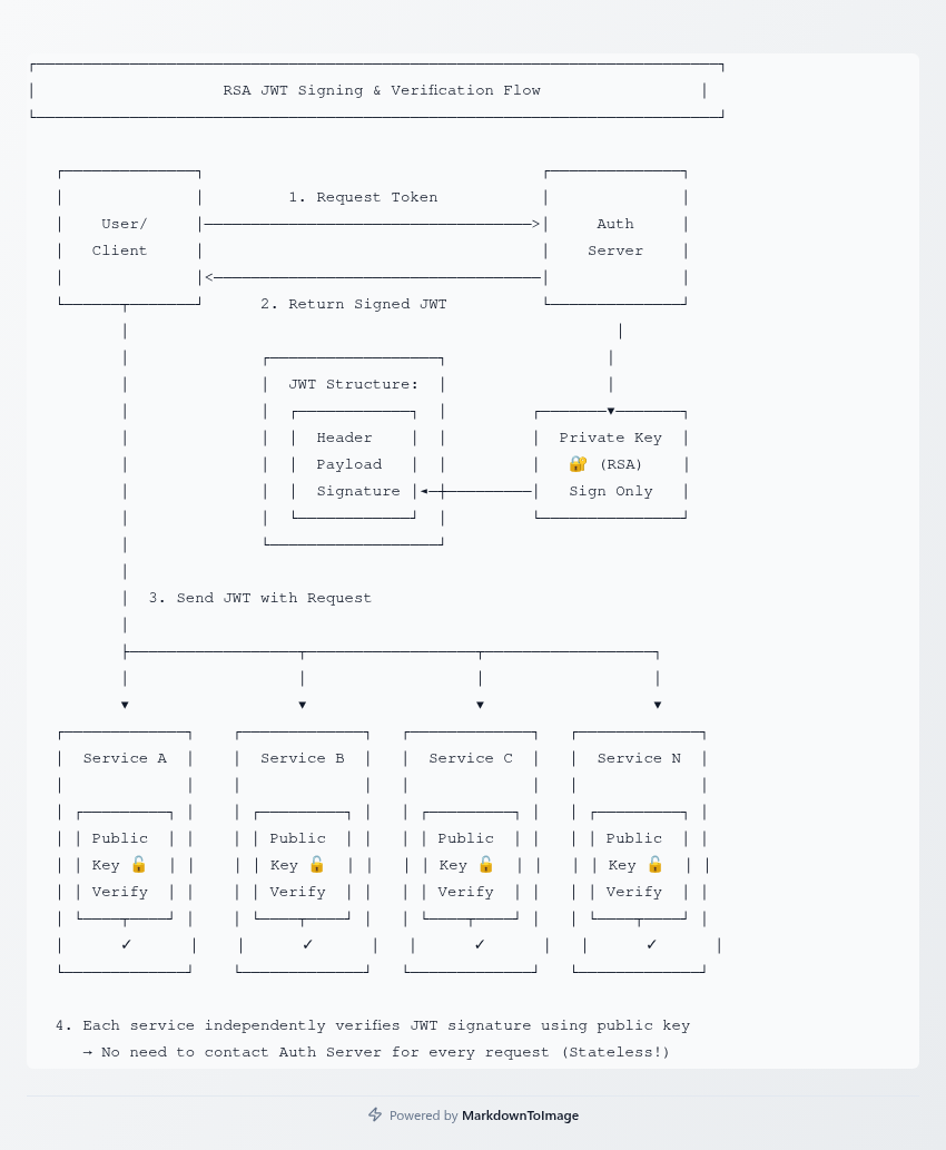 The RSA JWT approach offers significant benefits. Stateless verification scales horizontally without shared state, public key distribution is safe and straightforward, and different services can use different key pairs for isolation. Services don't need network connectivity to the authorization server for every verification, reducing latency and improving resilience.