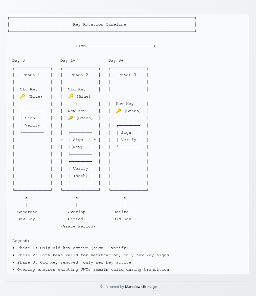 The rotation process must be seamless to avoid service disruptions. The standard approach uses overlapping key validity periods. Before decommissioning an old key, the new key must be distributed to all services. During the transition period, both keys remain valid for verification, but only the new key is used for signing. This overlap ensures that tokens signed with the old key continue to work while new tokens use the updated key.