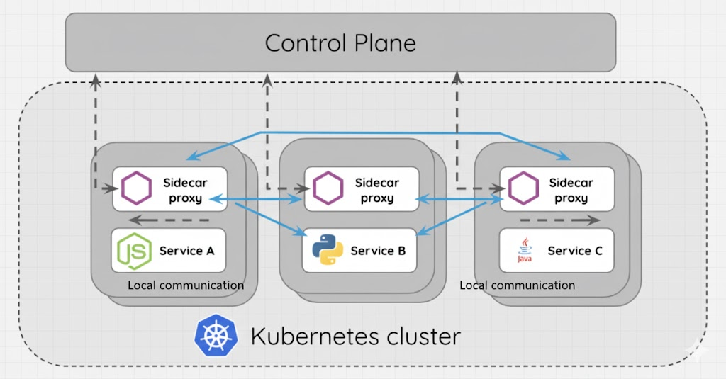 - Data Plane (The Messengers ✉️): This is made up of lightweight network proxies, typically deployed as sidecar proxies that run alongside each microservice container. Every bit of traffic entering or leaving your service goes through its sidecar. These proxies are the workhorses that enforce policies and gather data.